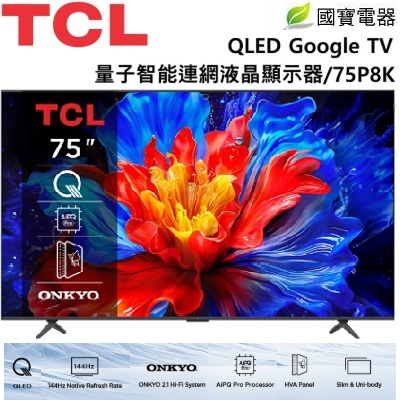 請先詢價 TCL 75吋 QLED Google TV 量子智能連網液晶 75P8K