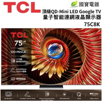 TCL 75吋 頂級 QD-Mini LED Google TV 量子智能連網液晶 75C8K